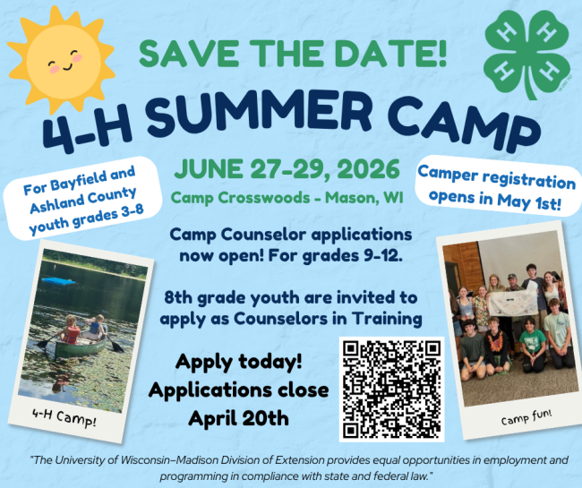 Youth in grades 9-12 are invited to apply as counselors for the combined Ashland/Bayfield County 4-H Summer Camp!